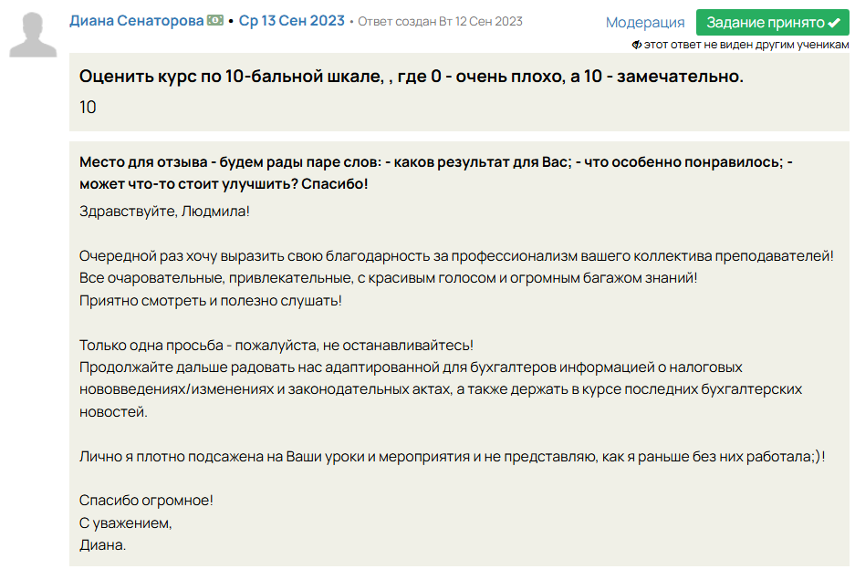 Добрый день, Людмила и вся Ваша команда ! Хочу выразить огромную благодарность за интересный , насыщенный новыми знаниями и познавательный месяц жизни! Программа курса, конечно, интенсивна,но это так заводит ! У меня были минуты тревоги, что я неудачно выбрала период обучения ( в связи с майскими праздниками уезжала на неделю ) и не смогу пройти все в срок, уроки высылались,а д/з я не выполняла. Но все успела !Спасибо за доходчиво поданный материал, примеры из жизни ,это намного упрощает его понимание !Для меня всегда было интересно получать новые знания и при достаточном опыте работы бухгалтером я снова их приобрела ,и они действительно новые ! С удовольствием порекомендую Вашу школу знакомым и буду следить за новыми курсами , и обязательно что-то найду для себя! Спасибо Олесе за ее комментарии к проверке ДЗ,они были всегда,не зависимо от того была ли это ошибочка или просто похвала !Удачи Вам в работе и процветания, учеников ,желающих получать новые знания ! С Вами легко и просто!